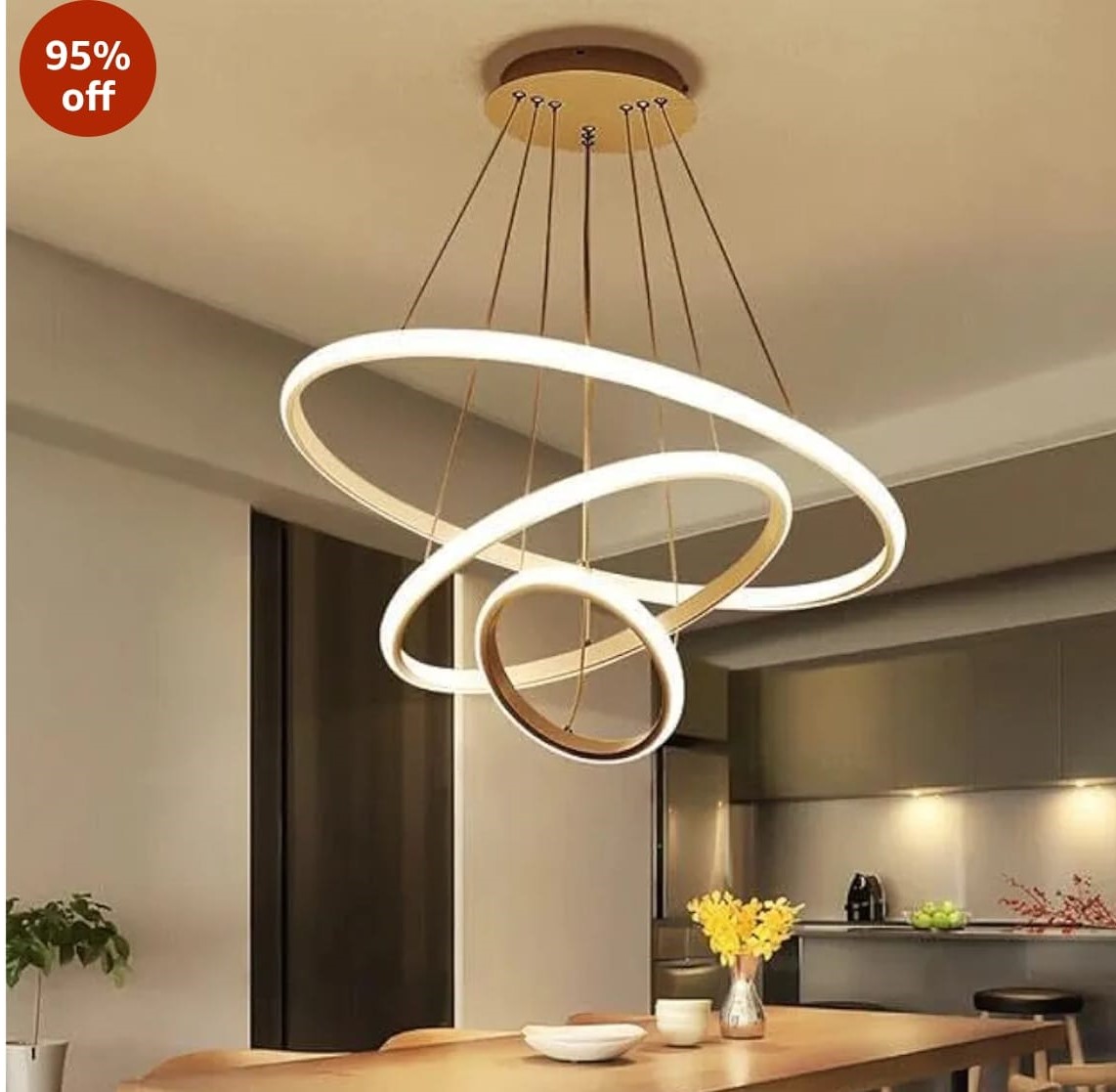 Design: Geometric circular ring design with multiple suspended LED rings Material: Aluminum frame with acrylic light diffuser Lighting: Energy-efficient integrated LED (warm white / cool white options depending on model) Mounting: Ceiling mounted with adjustable hanging cables Ideal for: Dining room, living room, kitchen, modern office, or reception areas Features: ✅ Dimmable (in some models with remote/APP control) ✅ Low power consumption compared to traditional chandeliers